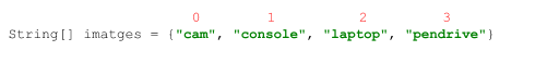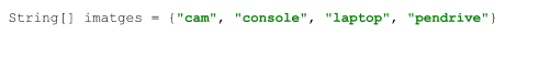 String[] imatges = {"cam", "console", "laptop", "pendrive", "cpu", "hdd", "printer", "sdcard"}; String[] noms = {"Càmeres", "Consoles", "Portàtils", "Pendrives", "CPUS", "Discs durs", "Impressores", "Tarjes SD"}; int[] ofertes = {10, 15, 30, 5, 20, 25, 35, 50};