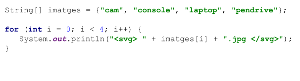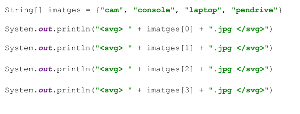 Quina avantatge té aquest codi respecte a l'anterior? Si ens fixem, estem repetint un patró. La instrucció System.out.println sempre és la mateixa i l'únic que varia és la posició del valor que agafem de l'array per a imprimir-lo. Podem transformar aquest patró en un loop.