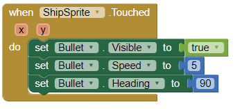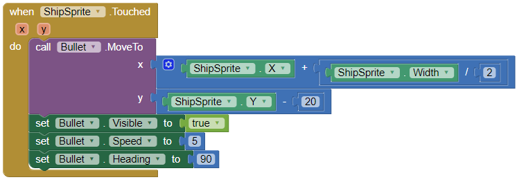 A continuació, volem assegurar-nos que la bala torna a aparèixer quan disparem des de la nau. Quan toquem la nau, volem que la bala comenci a moure's cap a l'alien. Ho farem utilitzant el gestor d' esdeveniments