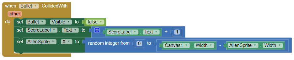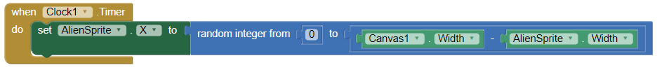 Fem el joc una mica més difícil! Ara, quan la bala xoca amb l'alien, canviem la seva ubicació. L'alien mantindrà el mateix valor Y, de manera que només haurem de canviar el X. Podem fer-ho mitjançant el bloc aleatori.