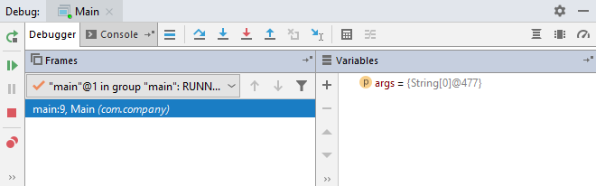 IntelliJ llançará la sessión de depuració. Compilarà i executarà l'aplicació, suspenent-la al primer breakpoint. Podem veure dues coses que han canviat:
