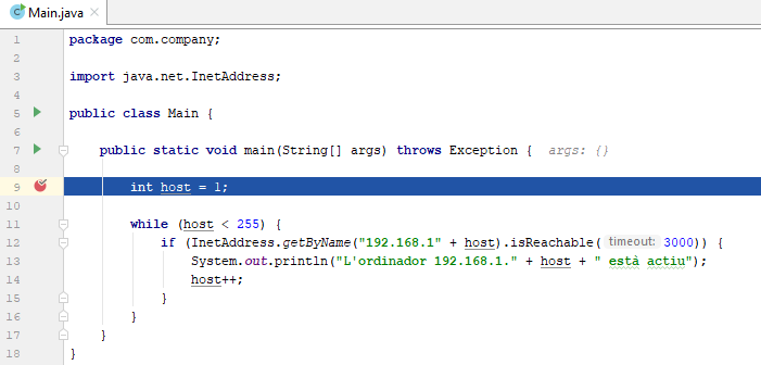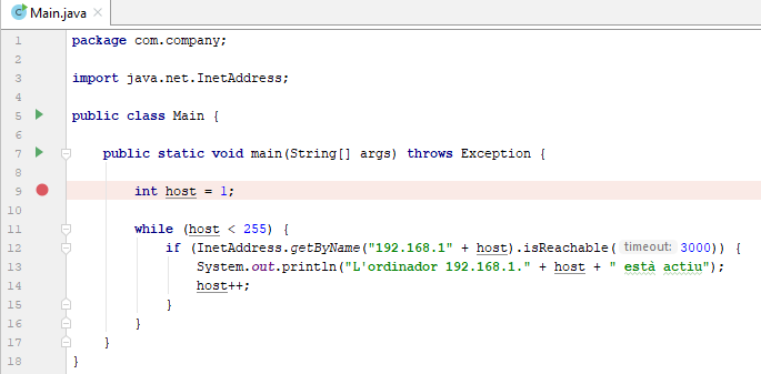 import java.net.InetAddress; public class Main { public static void main(String[] args) throws Exception { int host = 1; while (host < 255) { if (InetAddress.getByName("192.168.1" + host).isReachable(3000)) { System.out.println("L'ordinador 192.168.1." + host + " està actiu"); } host++; } } }
