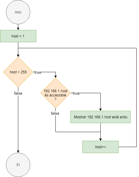 import java.net.InetAddress; public class Main { public static void main(String[] args) throws Exception { int host = 1; while (host < 255) { if (InetAddress.getByName("192.168.1." + host).isReachable(3000)) { System.out.println("L'ordinador 192.168.1." + host + " està actiu"); } host++; } } }