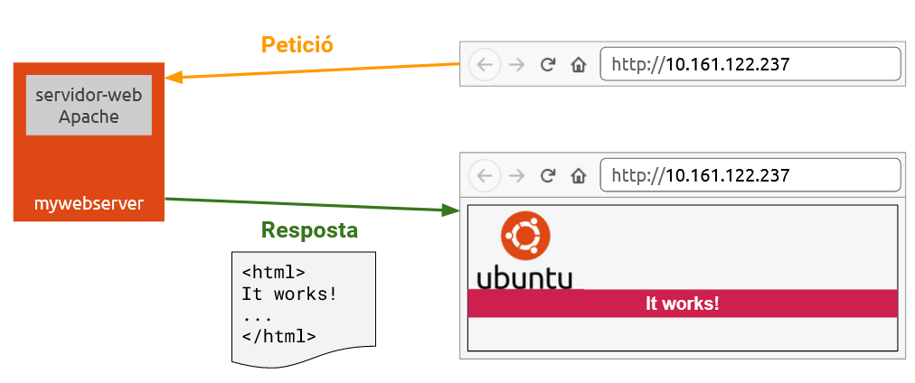 una petició al servidor Apache que tenim al contenidor. El servidor respon al Firefox enviant-li la pàgina que s'ha de mostrar.