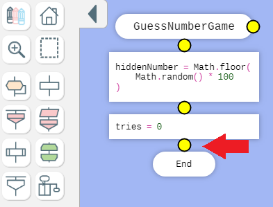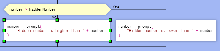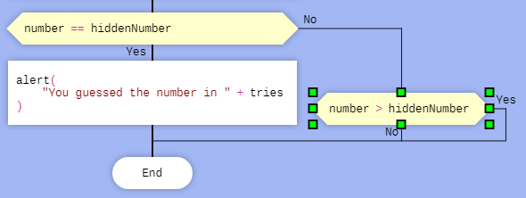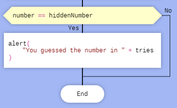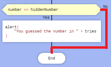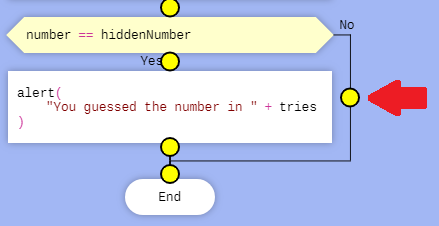 Tal i com està de moment el flowchart, si el jugador endevina el nombre se li mostra el missatge de que l'ha encertat. Però si no l'endevina, podem veure que el camí que segueix l'algoritme (marcat en vermell a sota) és, efectivament, no mostrar-li el missatge, però no obstant el joc finalitza igualment: