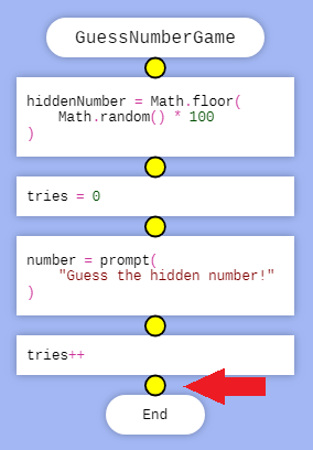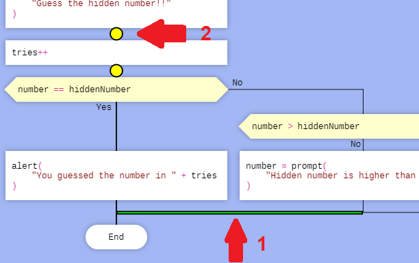 En cas de que no l'endevini i li hem de demanar un altre nombre, el programa ha de tornar a la instrucció que suma un intent i després tornar a comprovar si l'ha encertat aquesta vegada.
