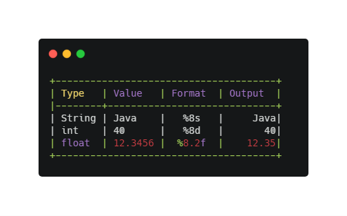 String textFormatat = String.format("|%-10s|%10d|%10.2f|", text, enter, decimal); System.out.println(textFormatat);