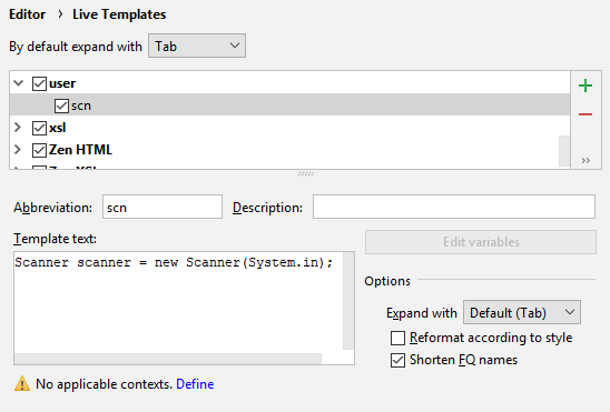 Mitjançant la utilització de live templates, podem inserir construccions usades freqüentment al codi. Per exemple, bucles, condicions, diverses declaracions o declaracions d'impressió. Per ampliar un fragment de codi, escriviu la template abbreviation corresponent i premeu