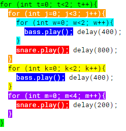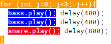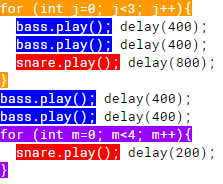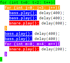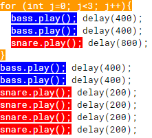 for (int j=0; j<3; j++){ bass.play(); delay(400); bass.play(); delay(400); snare.play(); delay(800); } bass.play(); delay(400); bass.play(); delay(400); snare.play(); delay(200); snare.play(); delay(200); snare.play(); delay(200); snare.play(); delay(200);