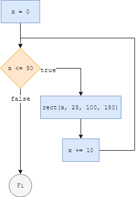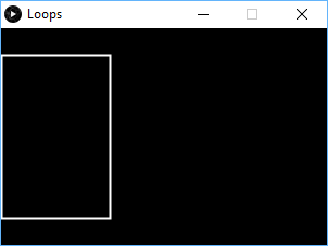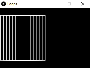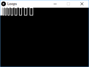 size(300, 200); background(0); stroke(255); fill(0,0); strokeWeight(2); int x=0; while (x <= 50){ rect(x, 25, 100, 150); x += 10; }
