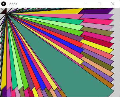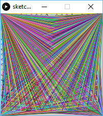 for(int i=0; i<height; i+=10){ for(int j=0; j<width; j+=10){ stroke(random(255), random(255), random(255)); line(j, i, width, height); stroke(random(255), random(255), random(255)); line(0, 0, j, i); stroke(random(255), random(255), random(255)); line(0, height, j, i); stroke(random(255), random(255), random(255)); line(width,0, j, i); } }