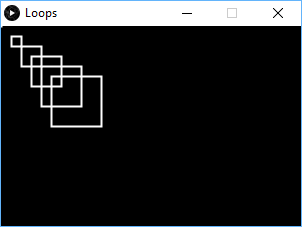 size(300, 200); background(0); stroke(255); fill(0,0); strokeWeight(2); for (int x=0; x <= 50; x += 10){ rect(x, x, x, x); }