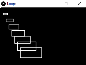 size(300, 200); background(0); stroke(255); fill(0,0); strokeWeight(2); for (int x=0; x<=70; x += 10){ rect(x, x*2, x+5, x/2); }