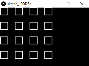 size(300, 200); background(0); stroke(255); fill(0,0); strokeWeight(2); for(int y=0; y<=150; y+=50){ rect(0,y,25,25); rect(50,y,25,25); rect(100,y,25,25); rect(150,y,25,25); }