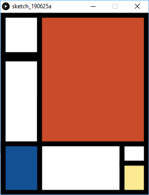 size(305, 375); stroke(0); strokeWeight(10); fill(255); rect(5, 5, 75, 81); rect(5, 95, 75, 190); rect(80, 180, 170, 190); rect(250, 270, 50, 40); fill(#ca4b2a); rect(80, 5, 220, 265); fill(#125093); rect(5, 270, 75, 100); fill(#fcea93); rect(250, 310, 50, 60);