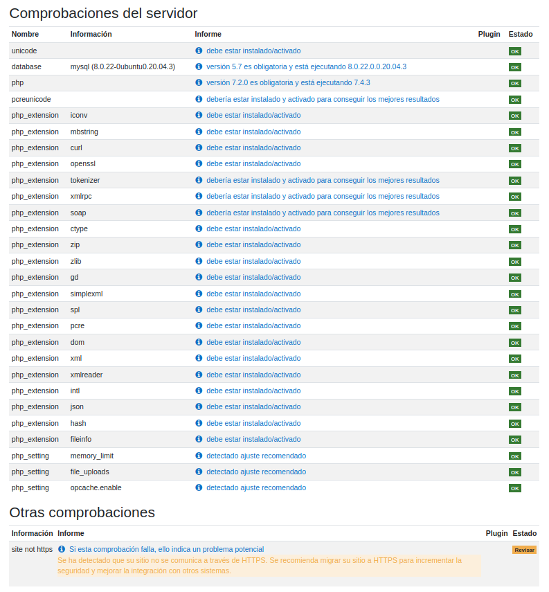 Se deben instalar todos los módulos de PHP necesarios, de forma que las "Comprobaciones del servidor" queden