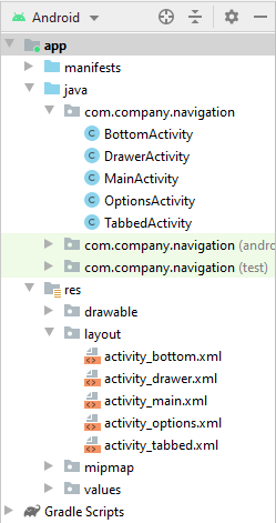 Empezaremos creando estas Activities, con los nombres: DrawerActivity, BottomActivity, OptionsActivity y TabbedActivity.