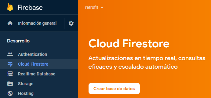 En el menú lateral haz click en Cloud Firestore. Luego en Crear base de datos