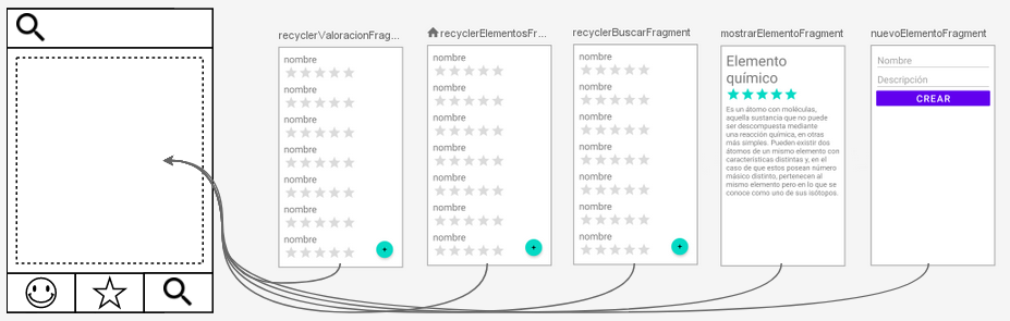 La MainActivity tiene el SearchView, el NavHost y el BottomNavigationView.