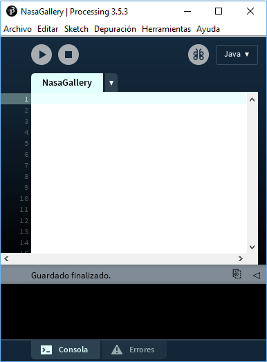 S'obrirà l'entorn de programació de Processing. Anomena i desa el projecte amb el nom